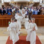 Der gelb-weiße Fahnenschmuck an der Pfarrkirche »St. Symphorian« machte es deutlich: Nach zwei Corona-bedingten Ausnahme-Jahren konnte dieses Jahr wieder am eigentlichen Zeller Erstkommunion-Wochenende gefeiert werden: 53 Mädchen und Jungen empfingen zum ersten Mal die Heilige Eucharistie.