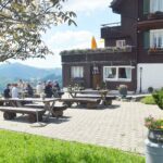 Wer konnte, wanderte nun bergaufwärts zum Bergrestaurant »Körnlisegg«. Die Aussicht von dort war atemberaubend schön und die Lions konnten das Alpenpanorama mit Einsiedeln genießen.