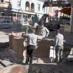 Die Firma hat auch den Auftrag bekommen, in diesem Zuge die notwendige Sanierung und Restaurierung des 1889 erbauten Röhrenbrunnens durchzuführen. Vor kurzem wurde das Fundament gegossen, um die schweren Sandstein-Teile aufzunehmen. Jetzt hat die Firma mit dem Wiederaufbau begonnen. Die Gesamtkosten für Abriss, Sanierung, Ausbesserung und Wiedererrichtung nimmt die Stadt rd. 28.000 Euro in die Hand.