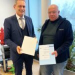 Pfundstein ehrte den Werkstattmeister des Unternehmens, Thomas Grafmüller, der seit 40 Jahren in der betriebseigenen Werkstatt die Verantwortung trägt für mehr als 350 Fahrzeuge, Maschinen und Großgeräte. Er erhielt hierfür die Urkunde und den Dank der Handwerkskammer und des Landes Baden-Württemberg.