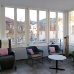 Im Engelbau der Sozialstation führten die Mitarbeiterinnen Martina Boschert und Marijke Heitzmann durch die Räume im Obergeschoss. Martina Boschert zeigte sich begeistert von dem Wintergarten: „Diesen Raum lieben wir über alles. Die alten Balken wurden erhalten und Alt mit Neu sehr gelungen kombiniert.“ In jeder Richtung gebe es etwas Sehenswertes zu beobachten und die Gäste fühlen sich „mitten drin im Städtle, mitten im Leben“. Nebenan ist eine große Terrasse für die warmen Tage. In der Küche wird das Mittagessen vorbereitet, dass vom Seniorenzentrum geliefert wird. Im Ruheraum kann nach dem Mittagessen ein Mittagsschlaf gehalten oder einfach ausgeruht werden. Im Aufenthaltsraum wird am großen Tisch gegessen, dort finden Spiele statt sowie das Aktivierungsprogramm mit Gedächtnisübungen und weiteren Angeboten.