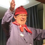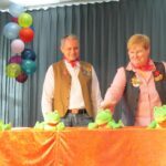 Mit dem »Chor der Frösche« hatten die Ministranten eine originelle Nummer vorbereitet. Fünf Frösche sitzen aufgereiht auf einem Tisch und unter jeden Frosch sitzt verdeckt ein Ministrant. Wenn man einem Frosch auf den Kopf tippt, singt er ein paar Wörter einer bekannten Liedzeile, der nächste Frosch eine andere. Die knifflige Aufgabe war es nun, die Frösche in der richtigen Reihenfolge anzutippen, damit die Liedzeile Sinn ergibt. Nach Bruder Berthold durften sich Bürgermeister Günter Pfundstein mit Ehefrau Heike daran versuchen. Zuerst tippen sie alle Frösche an, um das Lied zu erkennen, zum Beispiel »Das rote Pferd« oder »Cordula Grün«. Dann begann die Suche nach der richtigen Reihenfolge. Beide konnten die Aufgabe mit Bravour lösen. Danach wurde das Tischtuch gelüftet und die Ministranten zeigten sich dem Publikum.