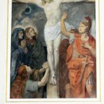 Abschließend folgte Station 13 »Jesus stirbt am Kreuz«. Konrad Schmider stellt in diesem Bild dar, wie Johannes nachdenklich die vom Kreuz entfernten Nägel in der Hand hält. Maria streichelt ein letztes Mal das Gesicht des Verstorbenen. Josef von Arimathäa kümmert sich um den Toten und bietet an, den Leichnam in seine Grabkammer aufzunehmen. Darüber sind die mittellosen Anhänger von Jesu sehr dankbar. Ansonsten hätten sie ein Grab ausheben lassen müssen und den Leichnam in einem einfach gezimmerten Sarg versenkt.
