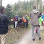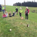 Zu Beginn durfte jedes Kind Eichhörnchen sein und eine Walnuss verstecken. Außerdem gab es noch jeweils eine kleine Tüte zum Erbsen sammeln, denn für jedes typische Osterwort, für jeden unterwegs aufgefundenen Gegenstand und für erfolgreiches Abschneiden oder die Teilnahme an Aktionen gab es eine Erbse. Gespannt, voller Vorfreude und aufmerksam startete die Wanderung. Bei jedem gelben Band an einem Baum wartete eine Spielstation. Und schon nach dem ersten steilen Anstieg durften sich Klein und Groß einen Miniosterhasen aus einer Eidose nehmen. Kurz darauf musste bei der ersten Station das angeschnürte Ei nach gewürfelter Sechs schnell vor dem Fangen gerettet werden. Beim zweiten Stopp folgte Sackhüpfen in extra dafür genähten blaugemusterten Säcken für große und kleine Hasjäger. Teils unermüdlich und federleicht hüpfend wurde um Erbsen gehoppelt. Bei der dritten Station wurde die Mitmachgeschichte der Hühner »Zick« und »Zack« vorgelesen. Es folgten ein bocciaähnliches Hasenspiel und ein typischer Löffel-Eierlauf. Zurück beim Ausgangspunkt sollte dann die Walnuss wieder gefunden und ausgebuddelt werden. Der Sieger mit 41 gesammelten Erbsen erhielt einen frisch gebackenen Hasen, bevor alle Kinder abschließend ihr Osternest suchten. Zur Stärkung wurden noch Apfelsaft und Kuchen für alle angeboten.