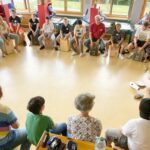 Schnell wurden alle Schüler in einem großen Kreis aufgestellt und Body Percussion mit der ganzen Schar arrangiert. Anschließend wurden alle Schüler in ihre Workshops aufgeteilt, in denen sie zwei Tage lang aktiv sind.
