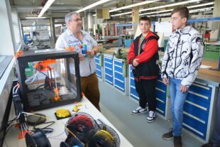 In der Ausbildungswerkstatt von Walter-Prototyp standen neben den klassischen CNC-Maschinen auch neue Techniken im Fokus. Ausbildungsleiter Wolfgang Lehmann (links) erklärte den jungen Besuchern auch die Möglichkeiten des 3D-Drucks für industrielle Anwendungen oder den Einsatz von Industrierobotern in der Produktion.