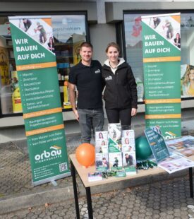 Vor dem Firmensitz der Orbau in der Nordracher Straße waren Paulina Engel (Gesamtbauleiterin) und Fabian Brosamer (Rohbauleiter) am Samstag „Streetworker“ in Sachen Berufsausbildung. Beide haben bereits eine erfolgreiche Karriere am Bau hinter sich und können aus ihrer Erfahrung berichten. Vom Maurer bis zum Dualen Studium ist bei der Firmengruppe Orbau vieles möglich. Das mittelständische Unternehmen bietet auch viele Stufen auf der Karriereleiter und damit vielversprechende Zukunftaussichten.