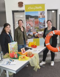 Was gehört zu welchem Be- ruf? Schwimmring, Computer, Spielzeug… Im Rathaus, in den vier Kindertagesstätten, im Familienbad oder im Betriebshof stehen Ausbildungsplätze zur Verfügung. Neu bei der Stadt Zell ist der Ausbildungsgang „Fachkraft für Wasser versorgungstechnik“. Daniela Herp (Personalamt, links), Melanie Brosamer (Personalamt, rechts) und Vanessa Bruder (Auszubildende, Mitte) gaben Informationen aus erster Hand.