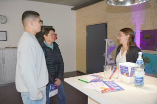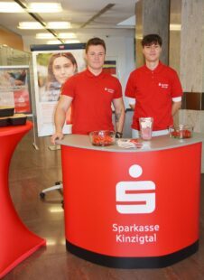 Azubis informieren angehende Azubis. Die Farbe der Sparkasse Kinzigtal vertraten beim „Tag der Ausbildung“ Lennart Perkams (links) und Noah Philipp (rechts). Beide sind im zweiten Ausbildungsjahr und angehender Bankkaufmann bzw. Finanz assistent. Sie konnten aus ihrem Berufsalltag berichten und darüber informieren, wie man bei der Sparkasse Kinzigtal und in der großen S-Finanzgruppe vorankommt. Gerade für die jungen Menschen, die den Tag der Ausbildung nutzen, sind junge Ansprechpartner besonders willkommen.