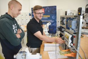 Die Firma AAM Metal forming bereitete den Besuchern in ihrer Ausbildungswerkstatt wieder einen großen Bahnhof. Constantin Baumann, Ausbilder für gewerbliche Berufe, und zahlreiche Auszubildende standen Rede und Antwort. AAM steht nicht nur für Metallberufe. Um das Werk Zell am Laufen zu halten, werden auch Elektroniker für Betriebstechnik ausgebildet. Die Elektro abteilung umfasst neun Mit arbeiter. Elektriker Luca Pressler (rechts) erläutert eine Schaltung.