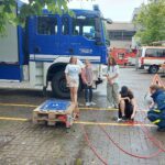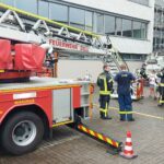 Nach einer kurzen Pause ging es auf den Schulhof und in die Sporthalle, wo verschiedene Aktivitäten auf die Schüler warteten. Mit der Drehleiter der Feuerwehr Zell konnten die Schüler hoch über der Schule einen Überblick über die angebotenen Aktionen gewinnen. Eine Umkleidekabine der Sporthalle wurde mit einer Nebelmaschine verraucht, um zu demonstrieren, dass in solchen Situationen nur noch mit einer Wärmebildkamera Hilfe geleistet werden kann.