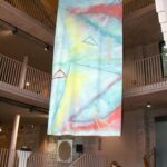 Germain Roesz hatte im hohen Raum der Galerie ein langes, buntes Banner aufgehängt. Die Farben, die nahtlos ineinander übergehen und sich zu neuen Nuancen mischen, werden von harten schwarzen Strichen scheinbar durchkreuzt. Im Gespräch verrät der Künstler, dass ihn das Verhältnis von Chaos und Ordnung interessiert. Trotz dieser skeptisch anmutenden Fragestellung verraten die hellen Farben einen optimistischen Blick auf das Leben.