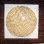 Samen stünden für den Anfang des Lebens. In ihnen sei die spätere Entfaltung und Schönheit angelegt. Deshalb verdienten sie unsere Wertschätzung, erläuterte Flaig. Im nächsten Schritt trug sie Samen auf Papiere auf. Diese Arbeit verlangt eine große Sorgfalt, denn oftmals sind diese verletzlich. In der Ausstellung zeigt sie einen großen Kreis, der grafisch exakt mit den Samen des Löwenzahns angefüllt ist. Weniger sensibel sind etwa die Kiefersamen, die sie in der Ausstellung in Form von Zeilen aufklebt. Während bei oberflächlicher Betrachtung alle gleich erscheinen, empfiehlt sie eine genauere Betrachtung, um die feinen Unterschiede zu entdecken.