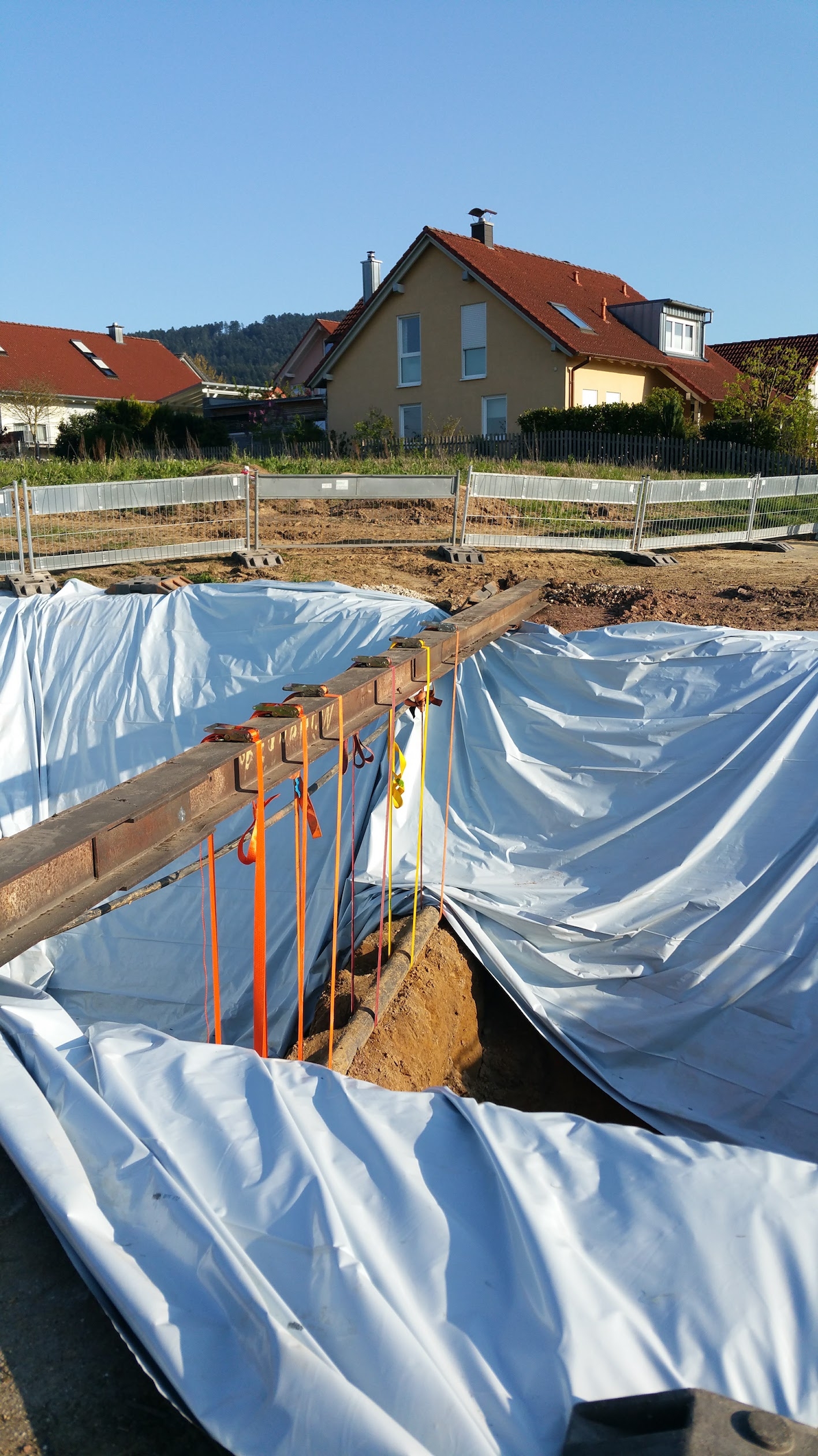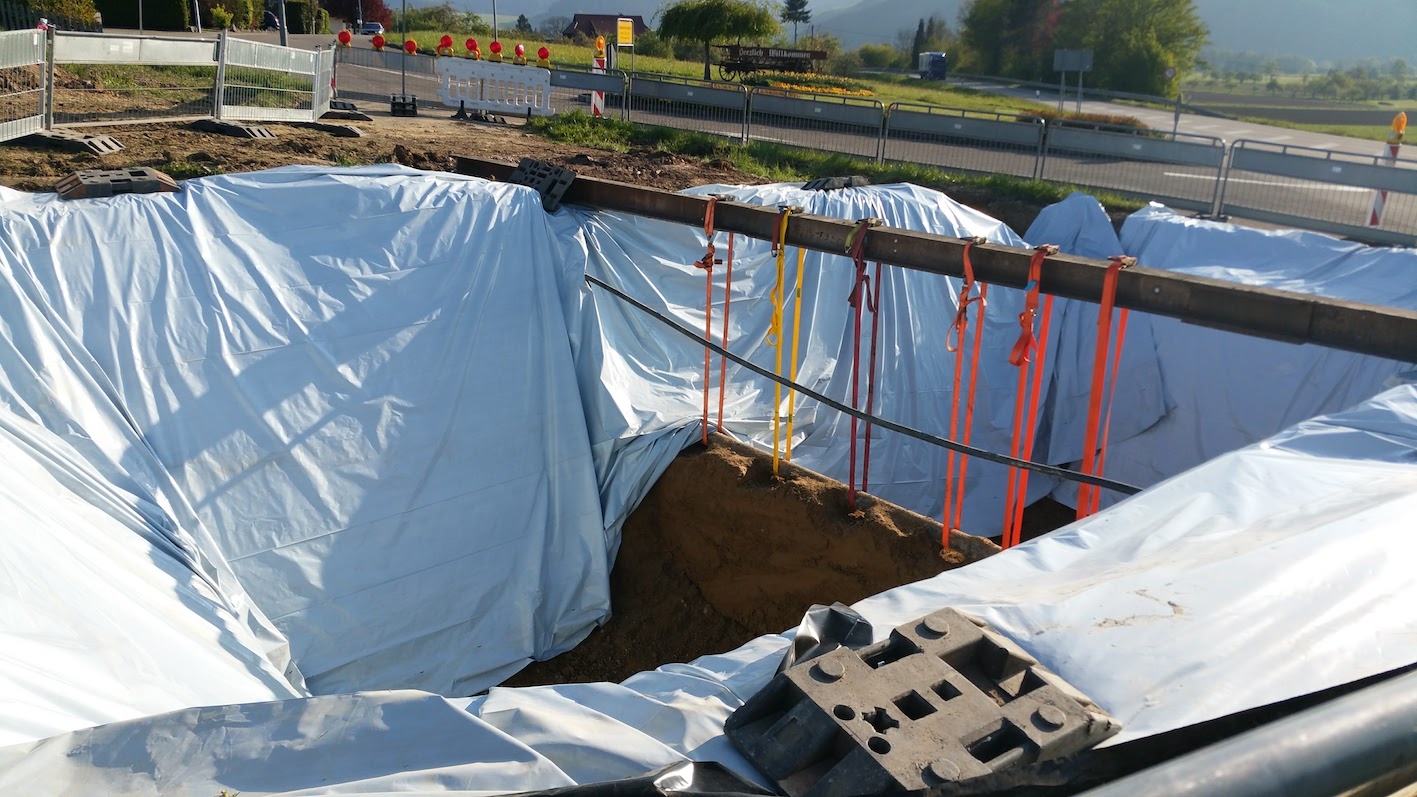 Unterhalb des Neubaugebiets verwehrt eine Grube die Nutzung des östlichen Radwegs. Sie ist für ein besonderes Verfahren ausgehoben: Die Firma »Terra Bohr und Press« aus Iggingen wird kommende Woche sechs Meter lange, im Durchmesser 40 Zentimeter starke Stahlrohre unter der Kreisstraße hindurchpressen. Mit einer Schweißnaht werden die Rohrstücke verbunden.