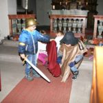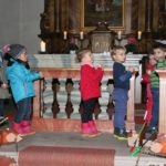 Mit dem gemeinsamen Lied »Tragt in die Welt nun ein Licht« wurde die Feier eröffnet. Passend zum Lied schritten die Kleinsten mit einem »feuersicheren« Licht um den kleinen Altartisch. Im Anschluss daran zogen sich die etwas größeren Kinder Kostüme an, um die großherzige Mantelteilung nachzuspielen. Die Gemeinschaft sang: »Sankt Martin mit dem Schwerte teilt/den warmen Mantel unverweilt.«