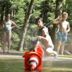 An sechs verschiedenen Stationen konnten die Kinder ausprobieren was man mit dem Feuerwehrschlauch alles machen kann. Als erstes musste ein Ball durch ein Labyrinth gespritzt werden. Das war gar nicht so einfach, denn es erforderte höchste Konzentration mit dem Wasserstrahl, den Ball an einem schräg gestellten Brett durch das Labyrinth zu spritzen. Dies gelang jedoch allen Kindern nach mehr oder weniger kurzer Zeit. Die zweite Station war die Wasserbombenstation. Hier musste mittels einer Handpumpe ein Luftballon innerhalb einer bestimmten Zeit mit Wasser gefüllt werden. Entsprechend unterschiedlich war dann die Größe der Wasserbomben, die dann mit größtem Vergnügen zum Platzen gebracht wurden. Bei Station Drei musste im Wettstreit zweier Gruppen jeweils ein Golfball durch einen Feuerwehrschlauch hindurch manövriert werden. Hier kam es auf Geschicklichkeit und die Zusammenarbeit der Kinder an. Bei der nächsten Station wurden auf der Straße oberhalb der Gehrmatt zwei Hütchen als Tor aufgestellt. Durch dieses Tor wurden dann mit dem Wasserstrahl weitere Hütchen hindurch gespritzt. Auch hier war Konzentration und Geschicklichkeit gefragt. Am Teich mussten dann zwei Gruppen gegeneinander antreten. Es galt von beiden Seiten aus einen an einer über den Teich gespannten Leine eingehängten Ball möglichst weit in die gegnerische Hälfte zu spritzen. Da hier der Strahl aus dem Schlauch stark sein musste, wurde er von einem der Feuerwehrmänner gehalten während die Kinder nur mit dem Strahlrohr zielen mussten. Da war ein ständiges Hin- und Her des Balles zu beobachten und eigentlich war kaum feststellbar, wer denn nun als Sieger aus diesem Wettbewerb hervorging. Dies war jedoch bei allen Spielen völlig unwichtig. Man sah es den Kindern an, dass es ihnen großen Spaß machte, genauso wie den Betreuern und den Männern von der Feuerwehr.