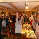Auch die körperliche Bewegung kann Glückshormone im Körper wachrufen. Die Gäste wurden aufgefordert sich von den Plätzen zu erheben. Da wurde nach wissenschaftlichen Erkenntnissen gewunken, Daumen hoch gehalten, gehüpft und die Arme hoch gerissen. Nicht nur der Bewegungsapparat wurde trainiert auch die Lachmuskeln.