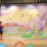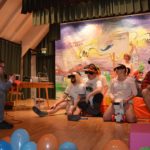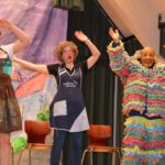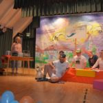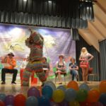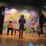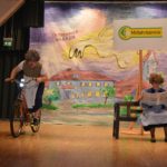 Für die dritte Szene ist (nun auch) die Bühne ganz im Besitz des Kindergartens. Nur ein Schreibtisch in der Ecke passt nicht recht ins Bild. Daran sitzt Isabell Berger als Ortsvorsteherin Andrea Kuhn und erledigt Amtsgeschäfte. »Alle müssen hier im Haus enger zusammenrücken«, erklärt sie das ungewöhnliche Arbeitszimmer, das sie sich mit Kleinkindern teilt. Auch andere Gruppen und Vereine, die im Dorfgemeinschaftshaus untergebracht seien, müssen zusammenrücken seit der Kindergarten vergrößert ist… Und schon kam die Kleinkindergruppe herein. An Amtsgeschäfte ist nicht mehr zu denken. Die Andrea der Narren darf Geschichten erzählen und wird von den Kindern mit Fragen gelöchert.
