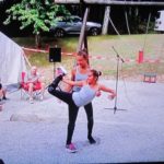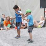 Dann nahmen wieder die kleinen Moderatoren Lukas und Colin den Platz auf der Bühne ein und kündigten den nächsten Auftritt an. Ronja und Noor, beide Mitglieder im Rock & Roll Club Zell legten einen tollen Tanz aufs Parkett beziehungsweise in den Kies. Begeistert klatschten die Kinder und die Gäste den Takt mit. Mit Musik und Tanz ging es weiter. Amelie, Emilia und Ronja zeigten einen der neuen Jugendtänze in einer Choreografie, bei der man den Eindruck hatte, als ob die Mädchen tagelang Zeit hatten diese einzustudieren. Dabei war die Idee dazu erst am Tag vorher entstanden. Als nächstes durften Colin und Lukas eine Quizshow ankündigen. Die hatte sich Henry mit den fünf Freunden Alexander, Julien, David, Marlon, Raik und Johannes ausgedacht. Er hatte nur einen Stein. Während Henry nur einen Stein hatte und sich deshalb »Einstein« nannte, rieselten auf den Gewinner eine ganze Handvoll Steine herunter.