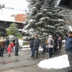 In einer langen Autokolonne steuerte man die Breitebene bei Hofstetten an und erlebte gleich eine winterliche Überraschung. War zu Hause vom Schnee des Vortags nicht mehr viel zu sehen, so erwartete die Wanderschar beim Schmalzenhof eine tief verschneite Winterlandschaft. Während die Kinderwagen mit den Kleinsten startklar gemacht wurden, flogen bei den größeren Kindern schon die ersten Schneebälle.