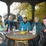 Nach einem kurzen Gedenken an Wanderfreund Josef Erdrich wählte man den breiten Weg zum Rebeck und ging durch den Herbstwald weiter zum Karl-August-Lehmann- Pavillon. Bereits im Jahr 1954 erbaut, bietet sich hier wohl der schönste Ausblick auf das heimische Dorf – selbst bei klassischem Novemberwetter. Unter dem schützenden Dach packte man die Rucksackvesper aus und Tourenführer Franz spendierte ein wärmendes Likörle.
