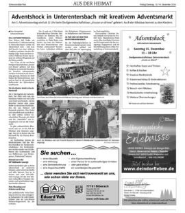 Zum dritten Mal findet am kommenden 3. Adventssonntag in Unterentersbach wieder ein Adventshock statt – und man darf bereits von einer schönen Tradition sprechen. Das fast 20-köpfige Orga-Team um Ortsvorsteher Christian Dumin hat erneut ein schönes Programm auf die Beine gestellt.