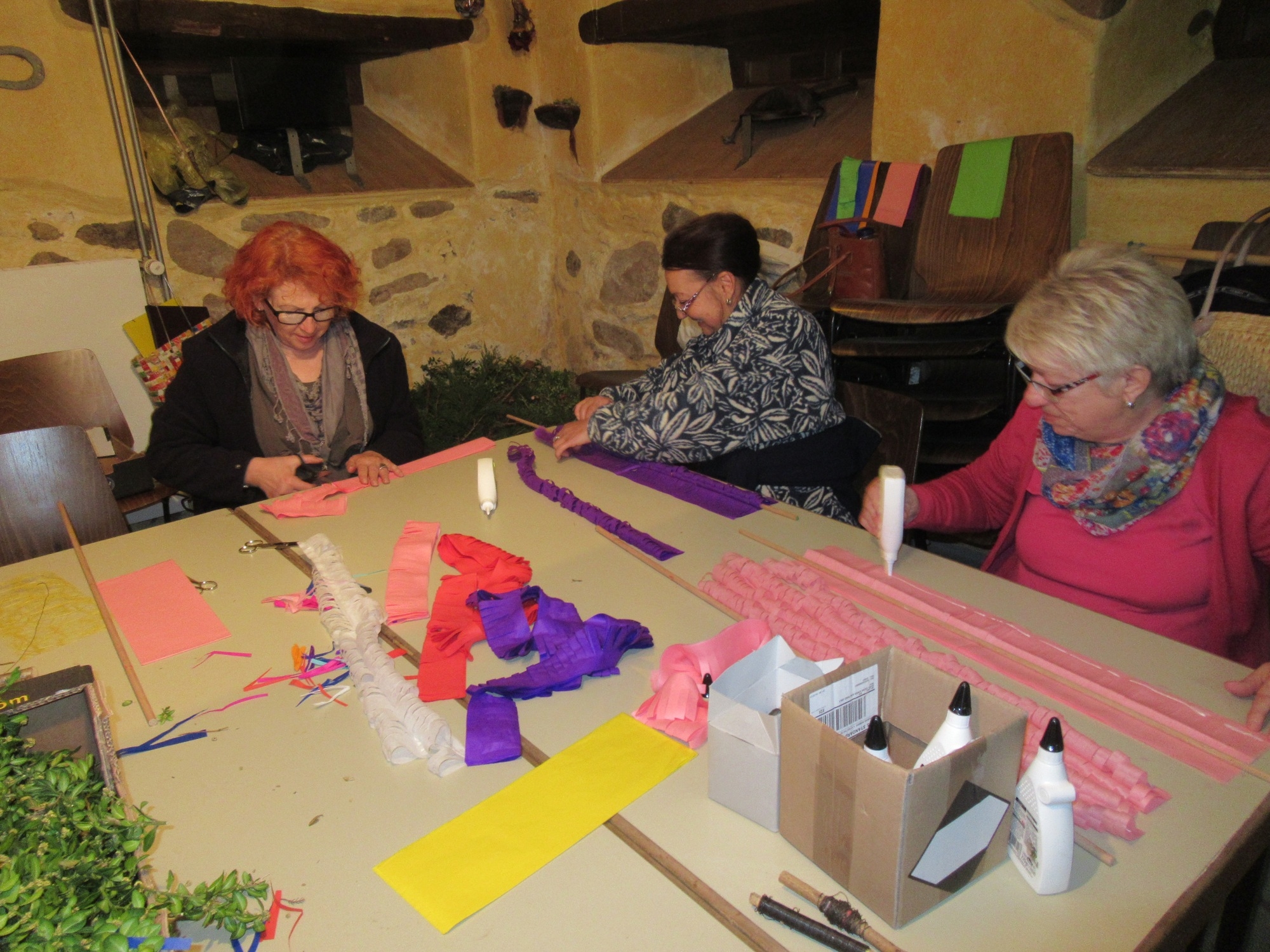 Dann waren die Frauen damit beschäftigt, dieses Material an den Palmstangen zu befestigen. Hier war Fingerfertigkeit gefragt und die Künstlerinnen bewältigten auch dies mit Bravour. Alle waren stolz darauf, dass an diesem Abend drei Palmen fertiggestellt werden konnten.