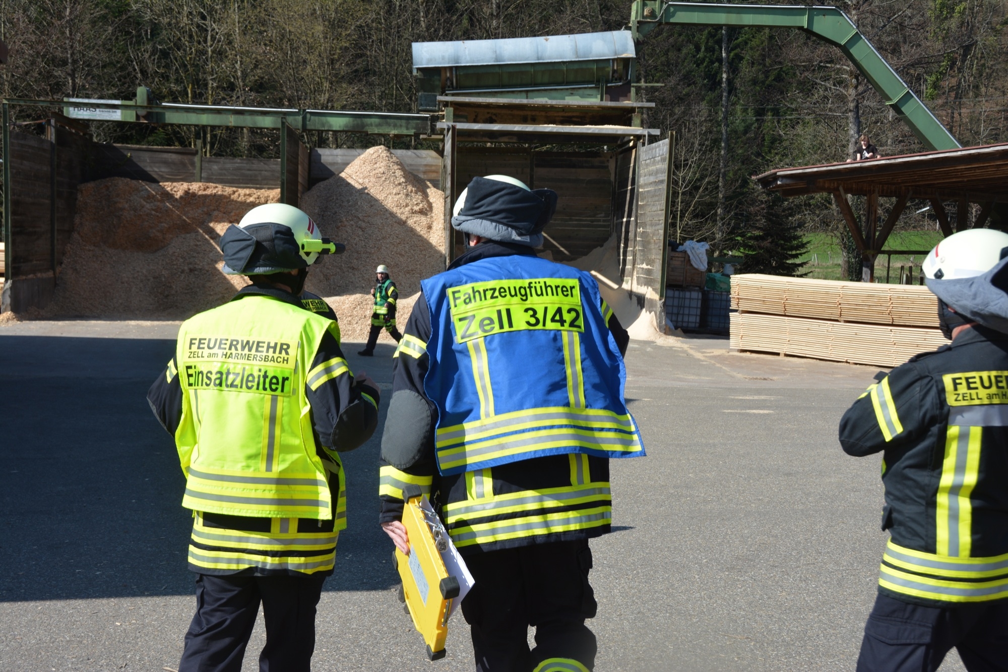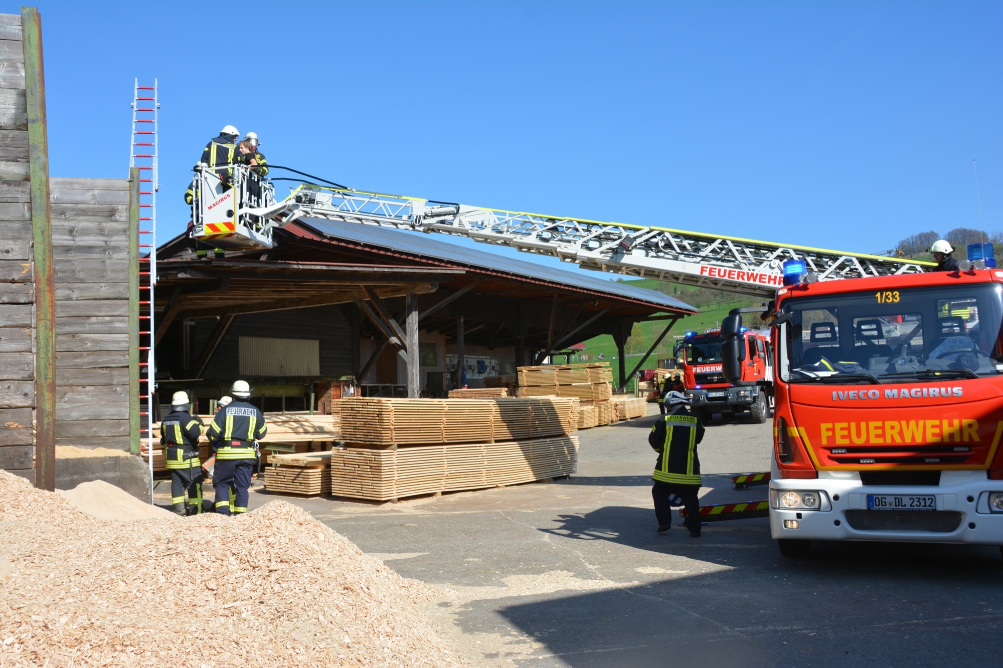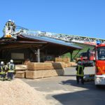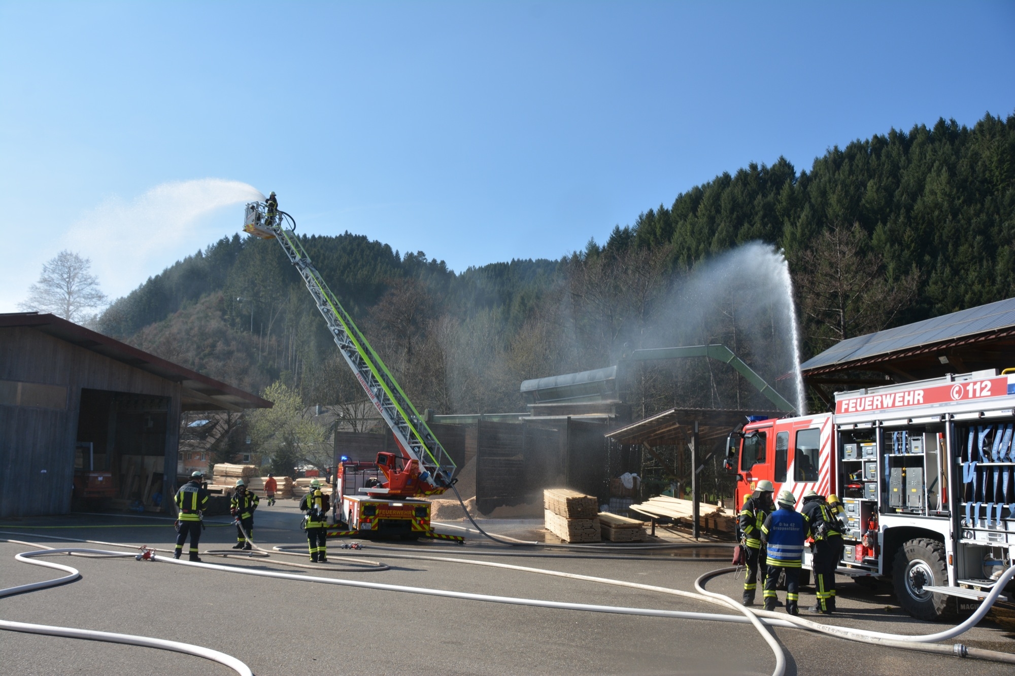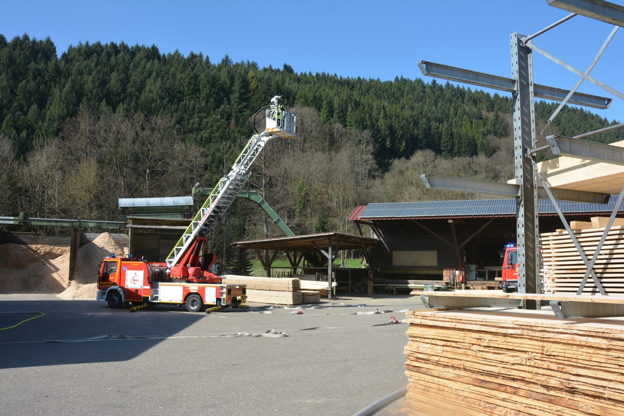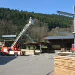 »Eine Schwierigkeit ist die beengte Zufahrt auf das Werksgelände«, informiert Gesamtkommandant Florian Lehmann über die Situation beim Sägewerk Burger. Die weiteren Einsatzfahrzeuge müssen zunächst wertvolle Zeit am Haltepunkt bei der Michaelskapelle verstreichen lassen, bis auch die Gengenbacher Drehleiter eingetroffen ist. Wären die anderen Fahrzeuge schon auf dem Gelände, könnte diese nicht mehr zum Einsatz kommen.