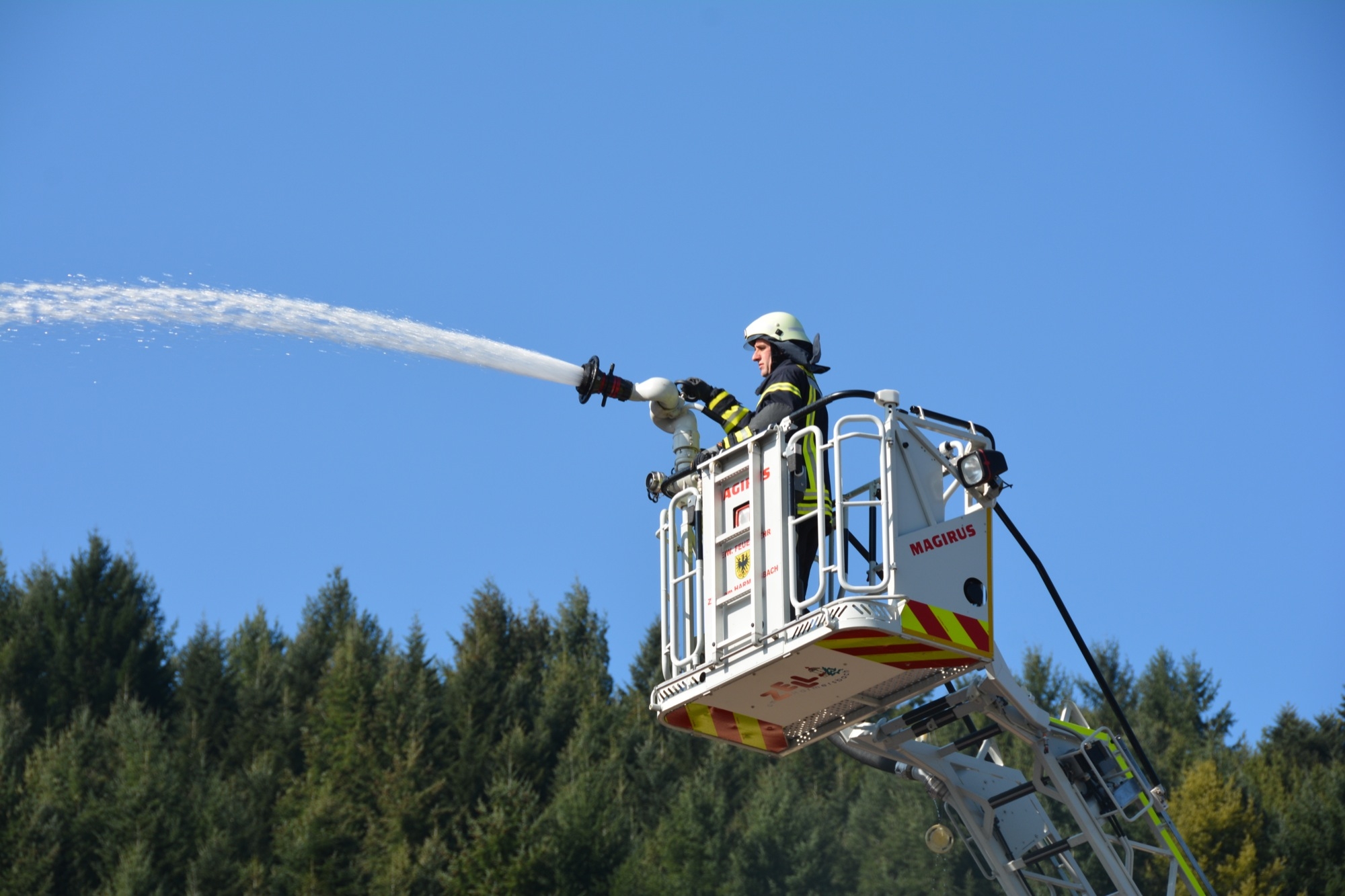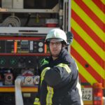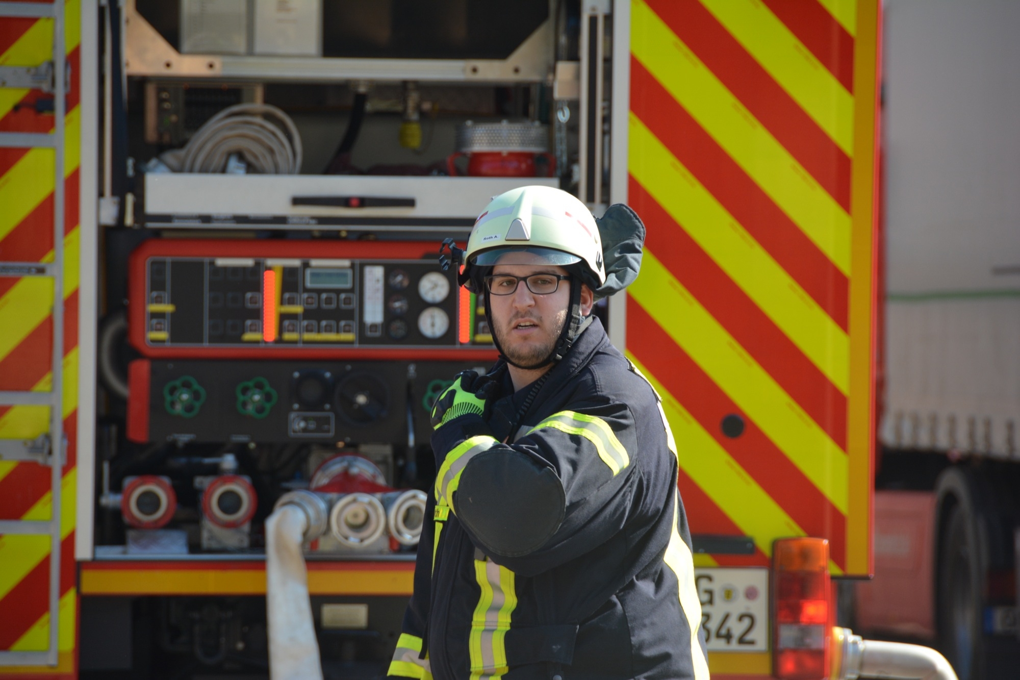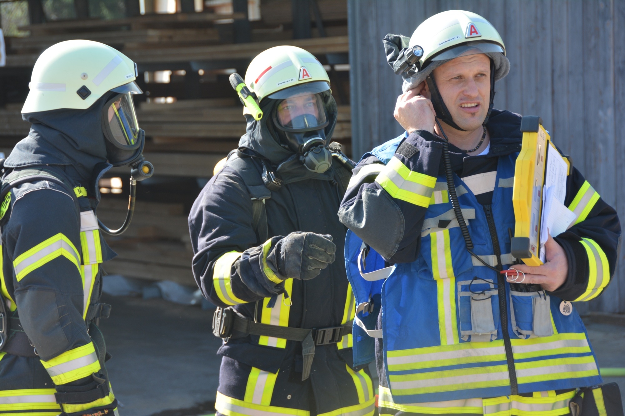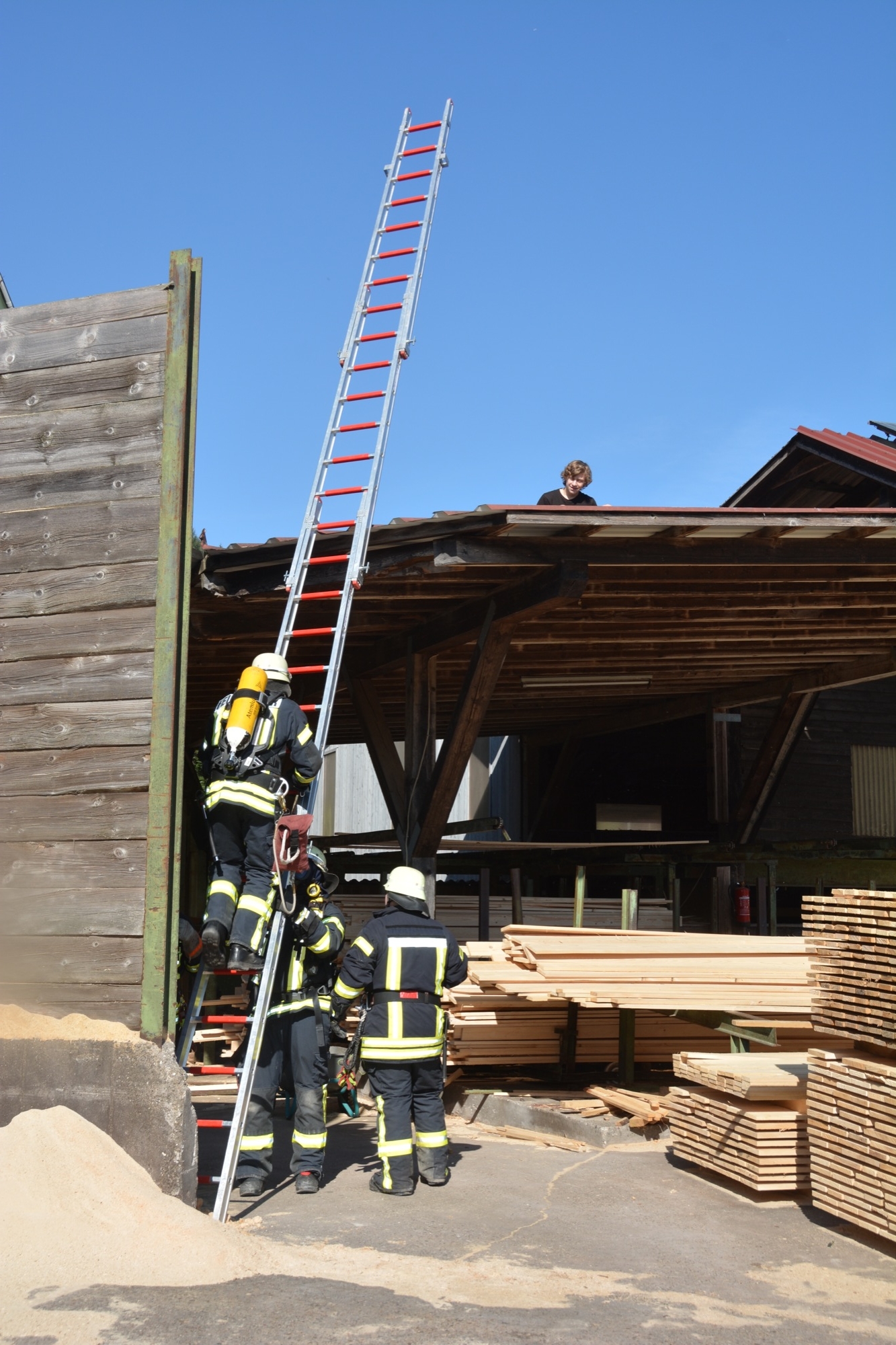 »Eine Schwierigkeit ist die beengte Zufahrt auf das Werksgelände«, informiert Gesamtkommandant Florian Lehmann über die Situation beim Sägewerk Burger. Die weiteren Einsatzfahrzeuge müssen zunächst wertvolle Zeit am Haltepunkt bei der Michaelskapelle verstreichen lassen, bis auch die Gengenbacher Drehleiter eingetroffen ist. Wären die anderen Fahrzeuge schon auf dem Gelände, könnte diese nicht mehr zum Einsatz kommen.
