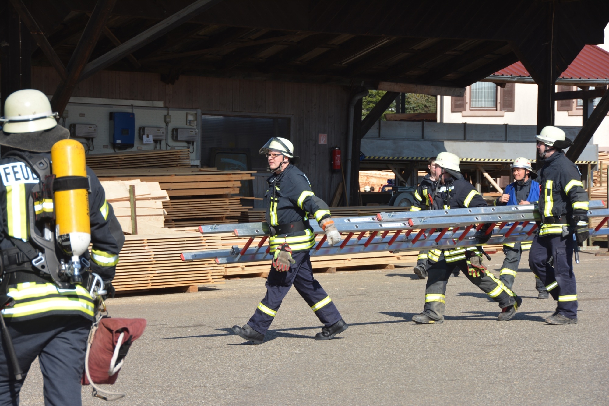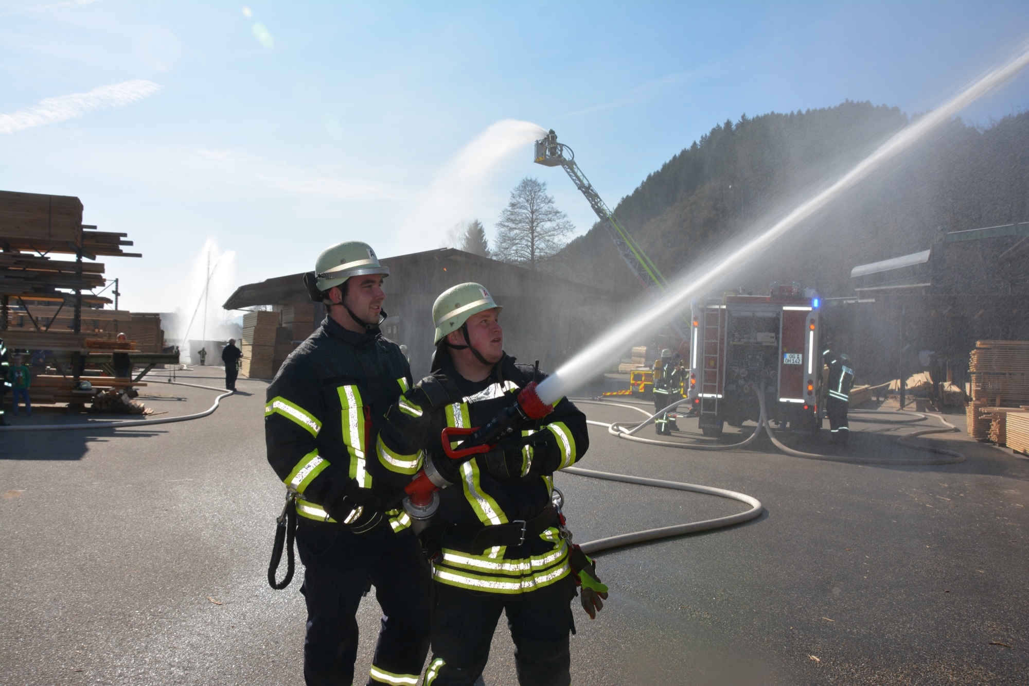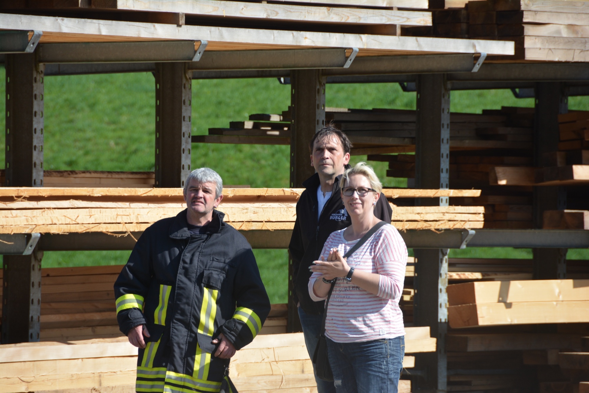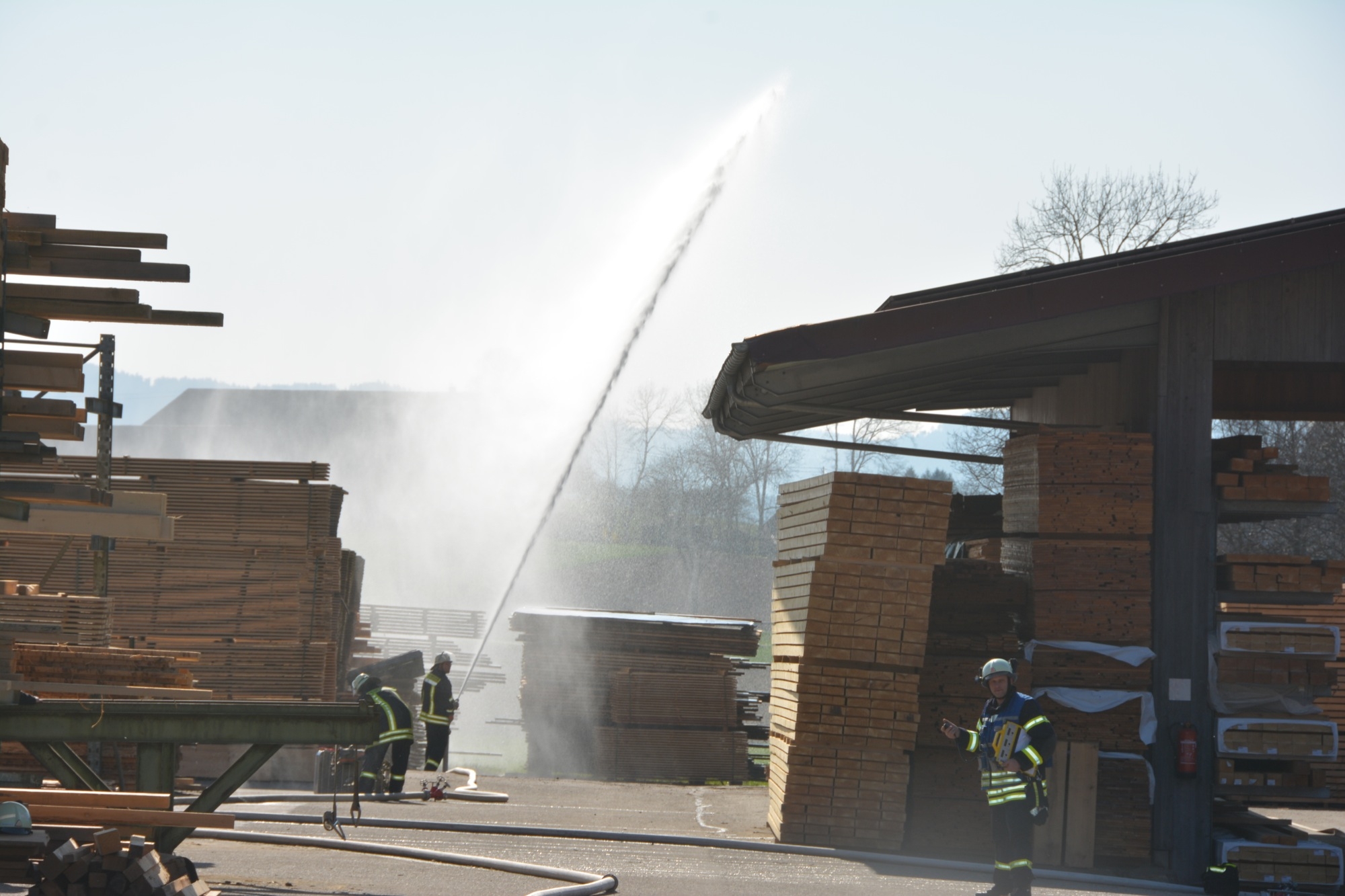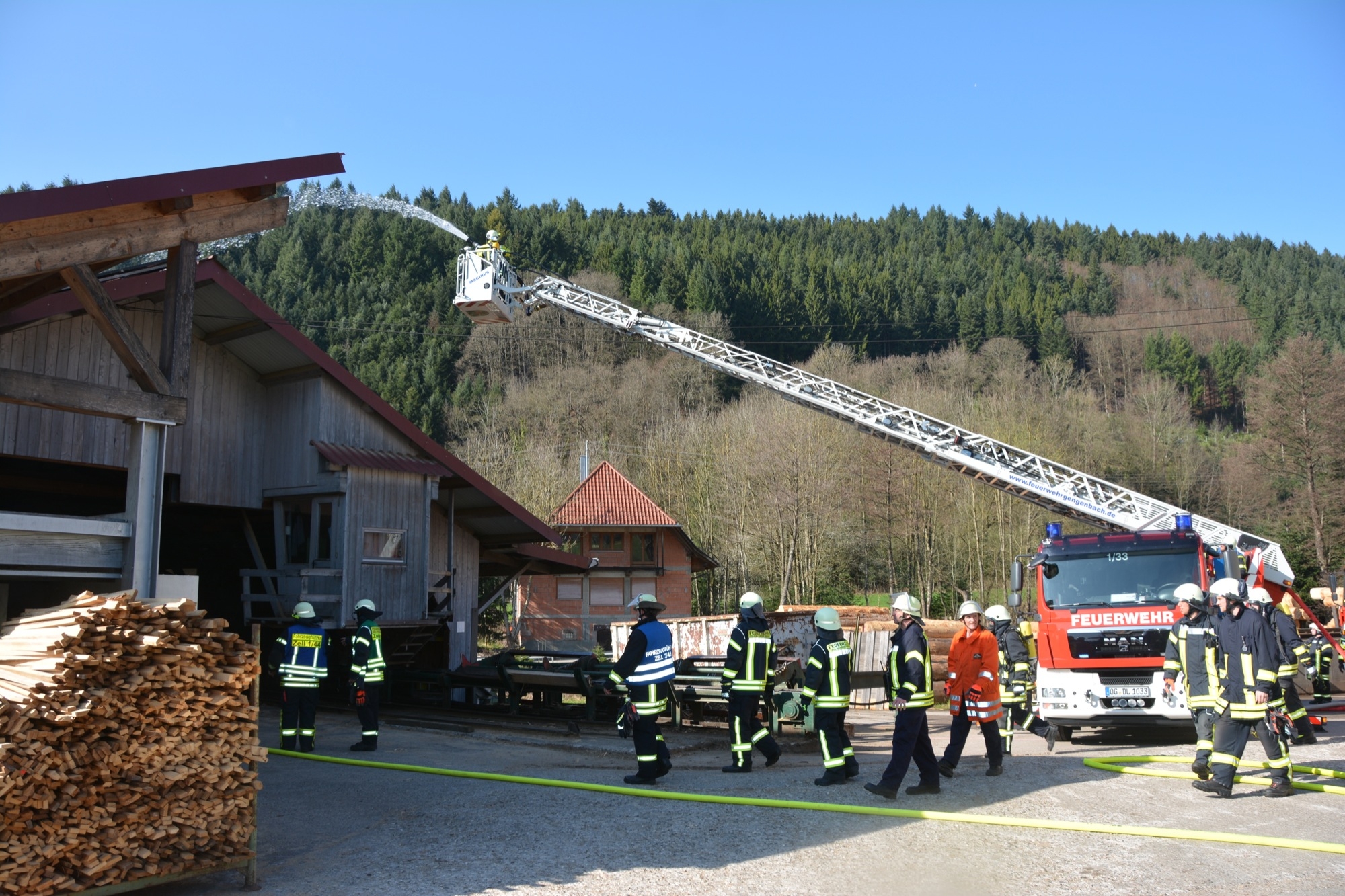 So üben die Kameraden bei der Frühjahrsübung nicht nur die notwenigen Handgriffe und die Zusammenarbeit zwischen den einzelnen Abteilungen, sondern gewinnen auch wertvolle Ortskenntnisse. Inhaber Bernd Burger informiert, dass für das Sägewerk ein Brandschutzplan erstellt wurde, wo unter anderem die Wasserentnahmestellen am Talbach und die Lage der Hydranten beschrieben ist. Bei der Frühjahrsübung gibt dieser den Einsatzkräften wichtige Hinweise – und natürlich erst recht im wirklichen Ernstfall. So ist die Familie Burger froh, dass ihr Sägewerk nach längerer Zeit nun wieder einmal als Übungsobjekt von der Feuerwehr ausgewählt wurde.