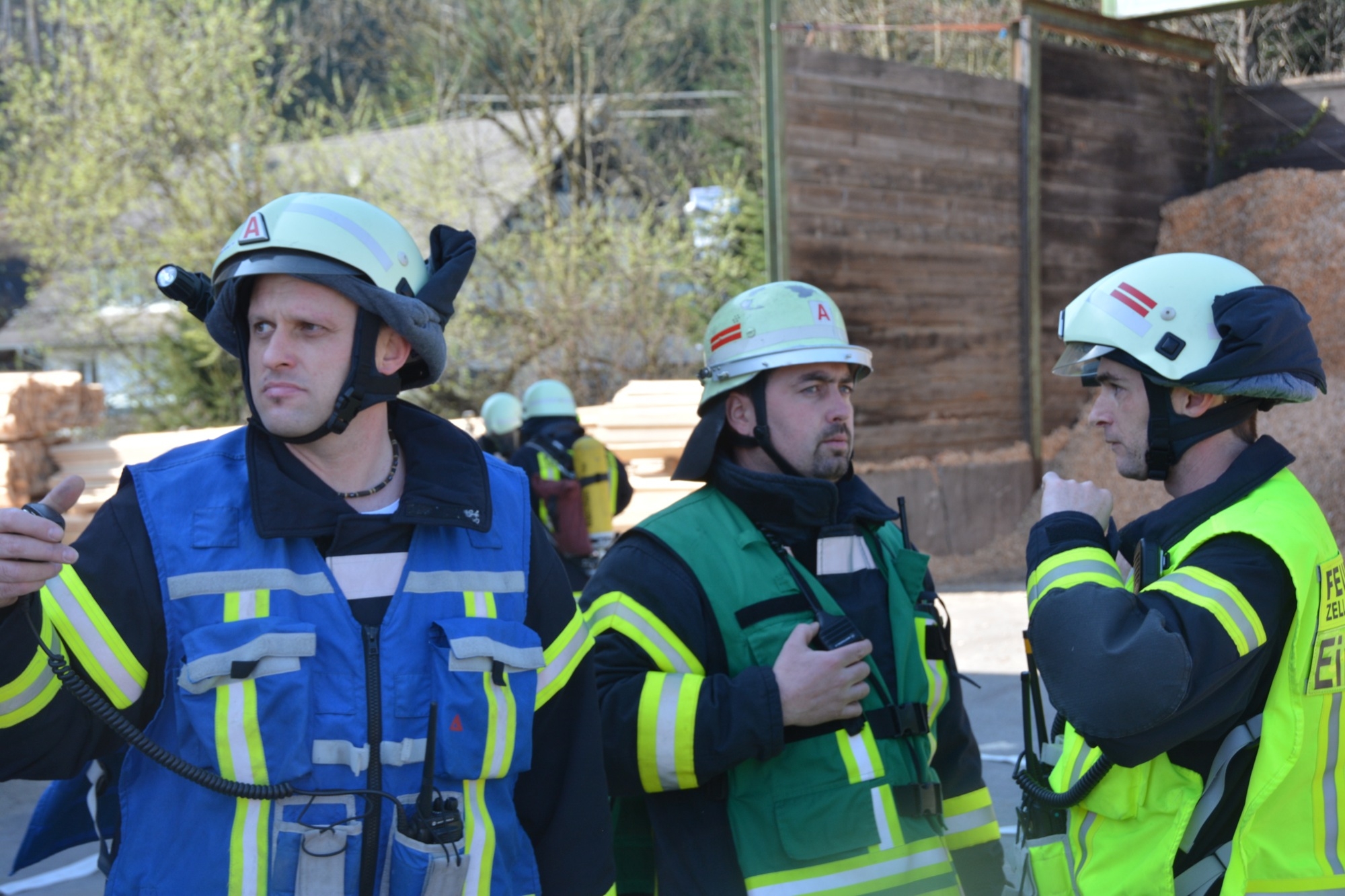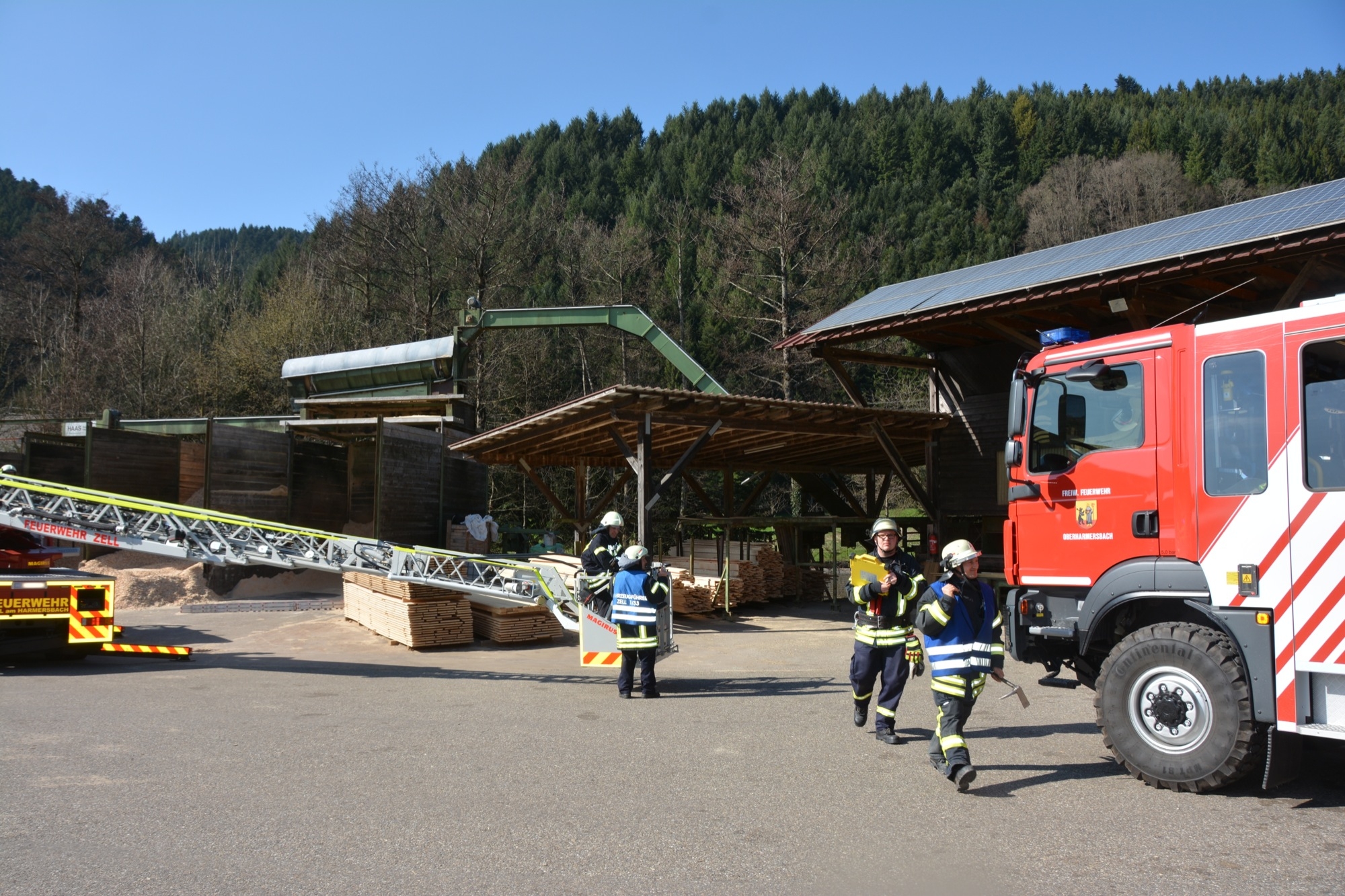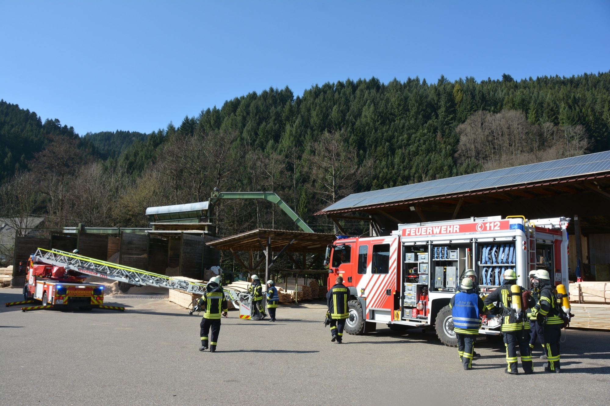 Die Zeller Gesamtfeuerwehr stellte sich bei ihrer Frühjahrsübung am Samstag einem realistischen Übungsszenario. Kinder spielen aufgrund eines Geburtstags auf dem Betriebsgelände des Sägewerks Burger. Beim Zündeln entfachen sie in einer der Produktionshallen ein Feuer. Dadurch kommt es wegen brennbarer Flüssigkeiten zu einer Verpuffung. Das Unglück nimmt seinen Lauf. Elf Personen werden verletzt. Durch den Funkenflug breitet sich das Feuer rasch auf eine zweite Halle aus und auch das Wohngebäude der Familie Burger ist bedroht.