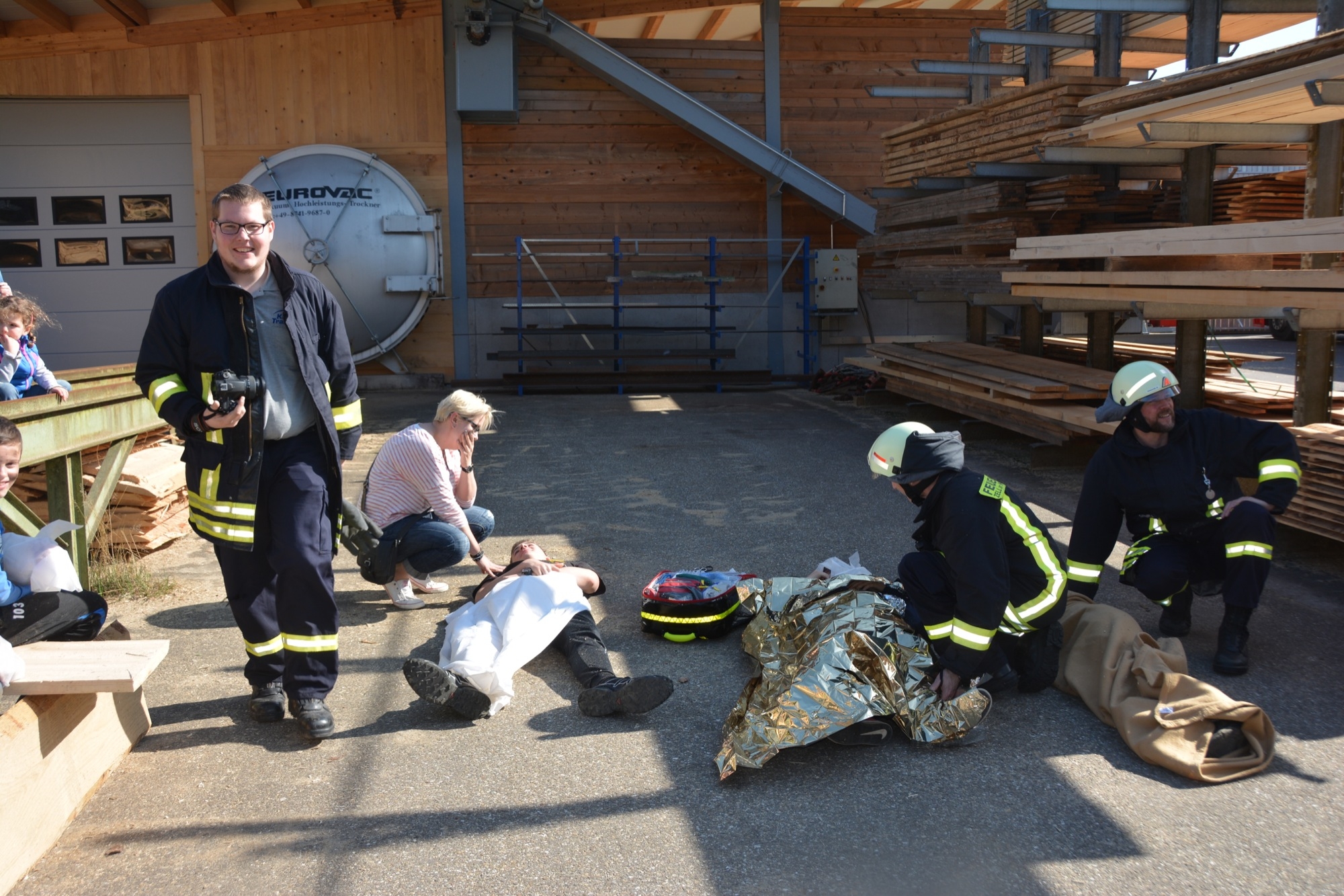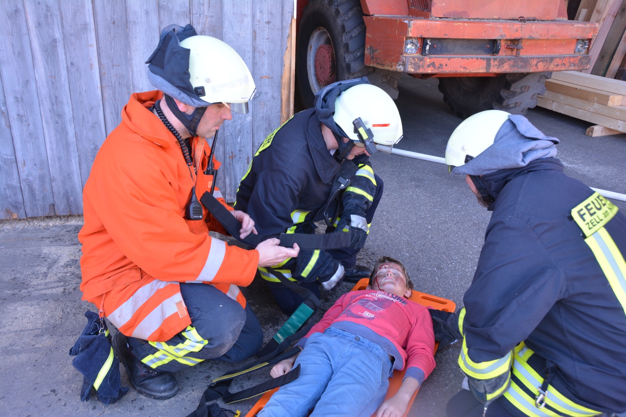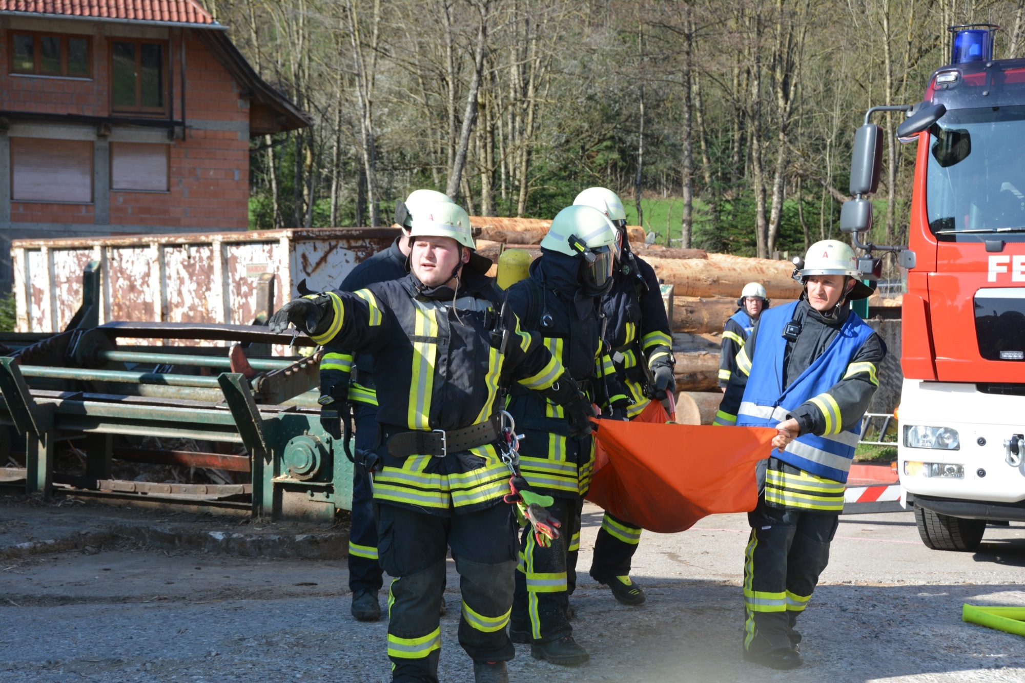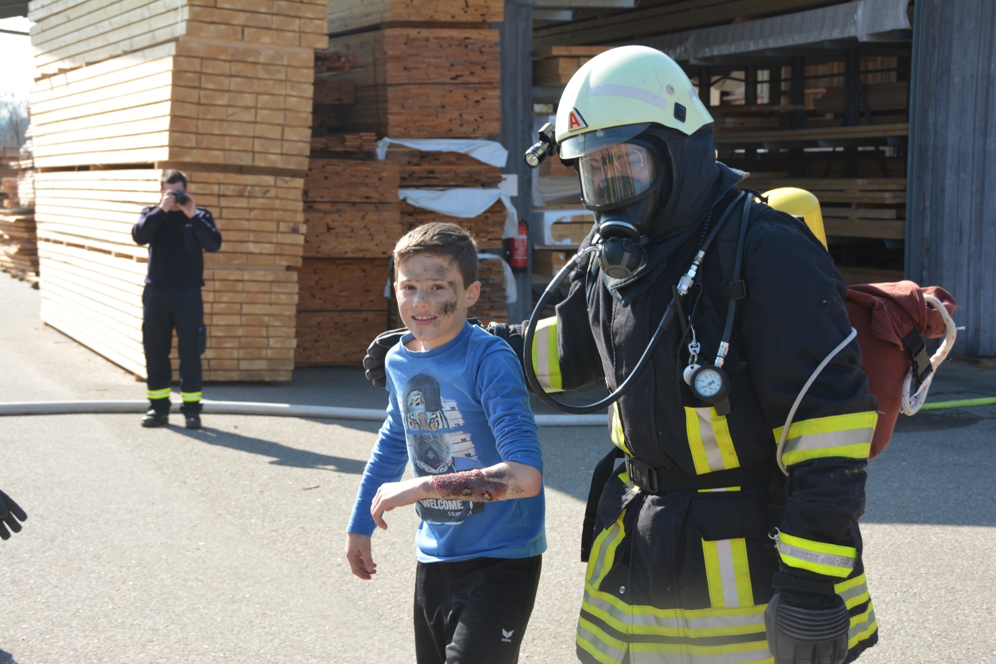 Die Zeller Gesamtfeuerwehr stellte sich bei ihrer Frühjahrsübung am Samstag einem realistischen Übungsszenario. Kinder spielen aufgrund eines Geburtstags auf dem Betriebsgelände des Sägewerks Burger. Beim Zündeln entfachen sie in einer der Produktionshallen ein Feuer. Dadurch kommt es wegen brennbarer Flüssigkeiten zu einer Verpuffung. Das Unglück nimmt seinen Lauf. Elf Personen werden verletzt. Durch den Funkenflug breitet sich das Feuer rasch auf eine zweite Halle aus und auch das Wohngebäude der Familie Burger ist bedroht.