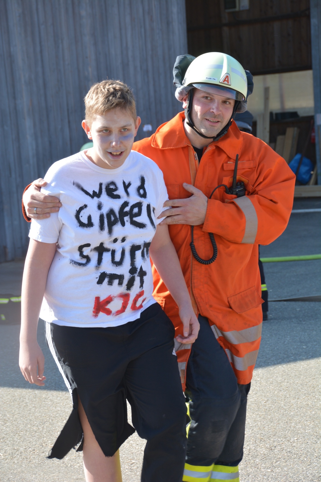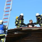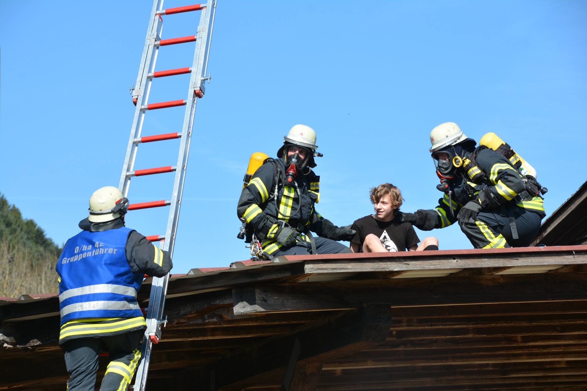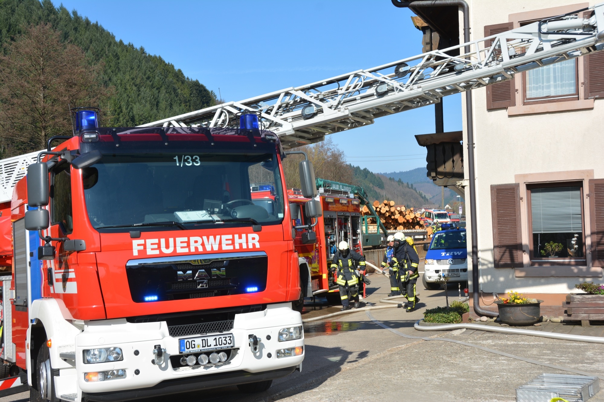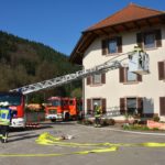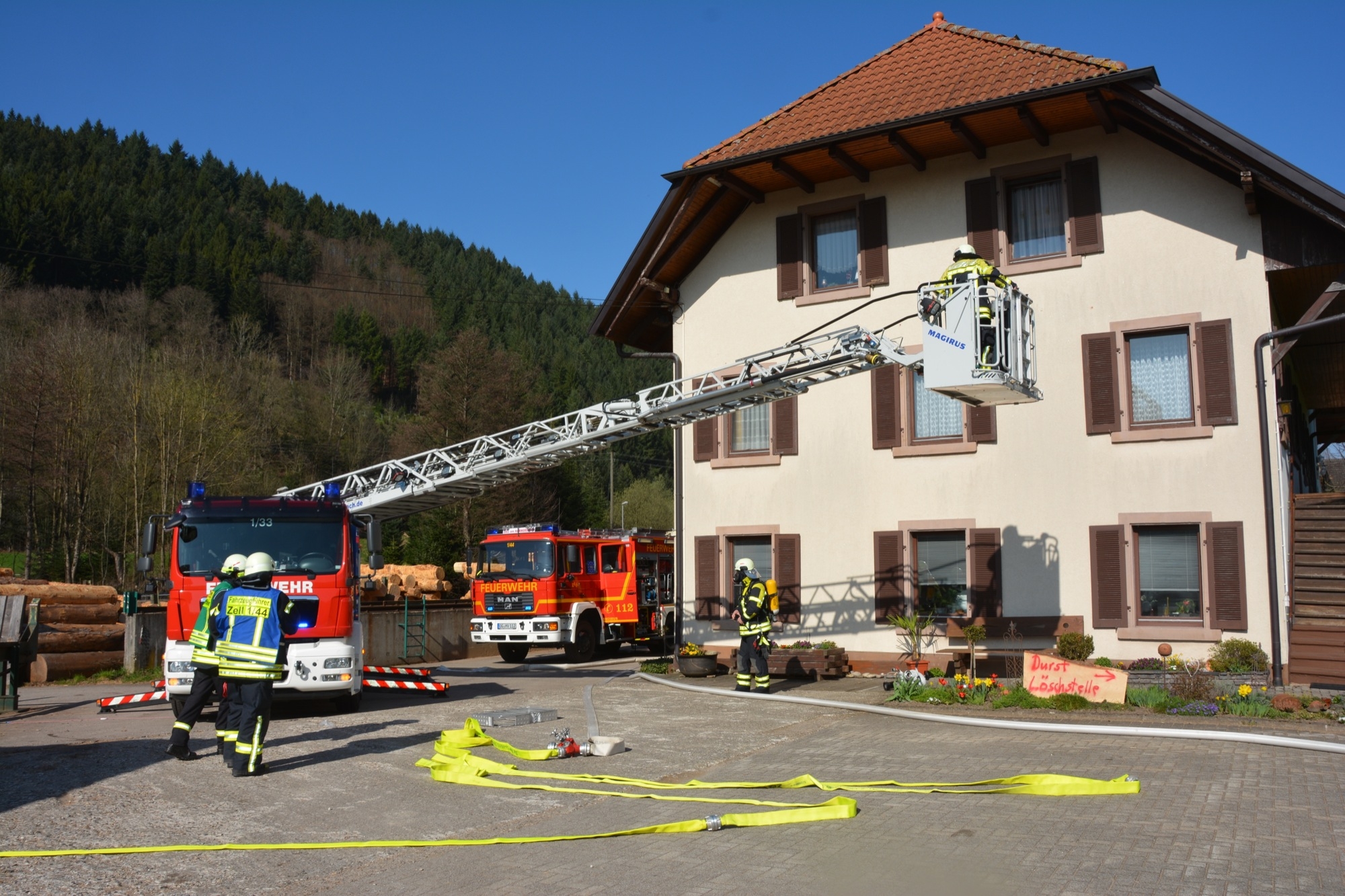 Menschenrettung und Brandbekämpfung lauten die Aufgaben für die heranrückenden Einsatzkräfte. Als erstes ist die Feuerwehr Unterharmersbach vor Ort und beginnt sofort damit, die verletzten Kinder zu suchen und diese aus dem Gefahrenbereich herauszubringen. Inzwischen ist auch die Nachbarwehr Oberharmersbach mit ihrem Löschgruppenfahrzeug am Einsatzort.