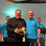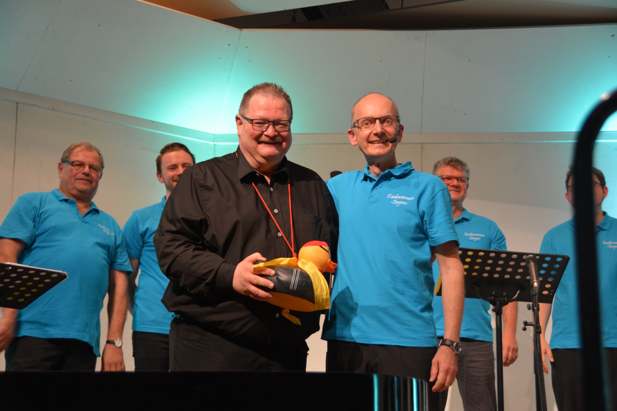 Die Zugabe »Wir hatten eine gute Zeit« der Wise Guys stellten die Sänger über ihr 10-jähriges Jubiläum. »Dieser Titel ist für uns Programm«, betonte Karl-Michael Kunner, denn der Projekt-Chor sei durch eine gemeinsame gute Zeit und seinen großen Zusammenhalt geprägt. Der musikalische Leiter Thomas Dreher durfte sich über eine Ehrung freuen, die es – so Moderator Kunner augenzwinkernd – noch nie gegeben hat: eine »Große Badewannen-Ente am Bande«. Stürmischer Applaus und Bravo-Rufe waren der Dank des begeisterten Publikums.