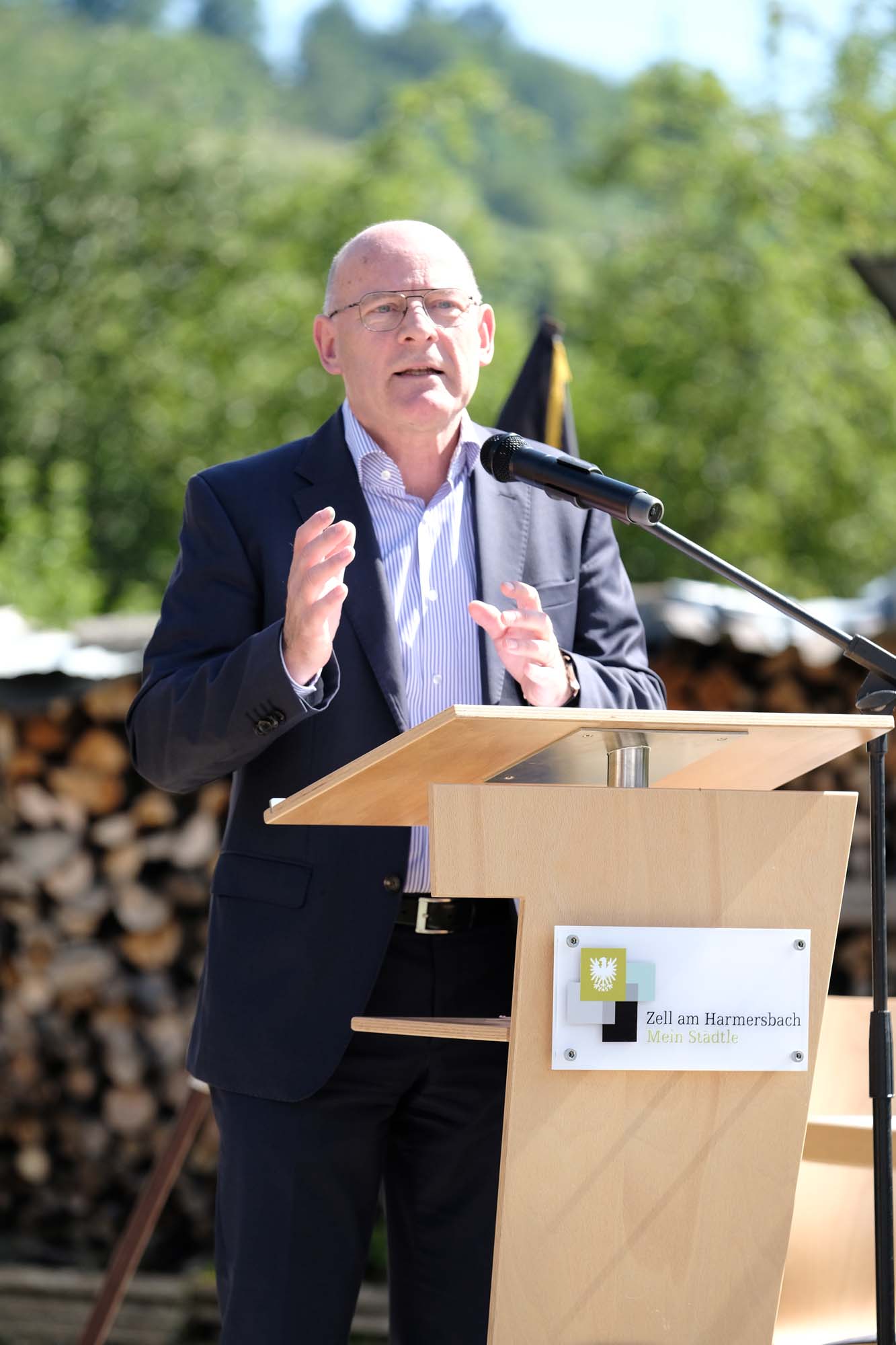 Bürgermeister Pfundstein erinnerte an die intensive Planungsphase, die aufreibenden letzten Wochen und die vorgelagerten Baumaßnahmen zur Ertüchtigung der Umleitungsstrecke. Sieben Häuser seien im Vorfeld der Straßensanierung abgebrochen worden. Dem THW, allen voran Walter Nock aus Zell, dankte Bürgermeister Pfundstein für den Bau der 30 Meter langen Behelfsbrücke. Dem Land dankte er für die finanzielle Unterstützung. Als klares Signal wertete Bürgermeister Pfundstein die einstimmige Vergabe des Hauptauftrags an die Baufirma Reif durch den Zeller Gemeinderat. Die Bevölkerung bat Bürgermeister Pfundstein um Mithilfe im Interesse des Gemeinwohls: »Denken wir nicht in Problemen, sondern stets in Lösungen – und setzen diese auch um!«
