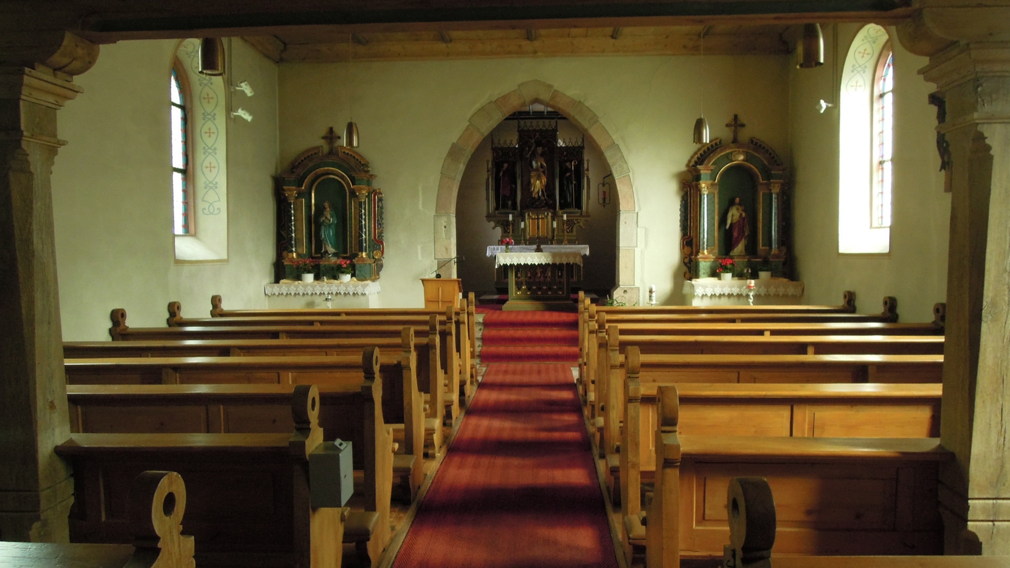 Wie in alten Urkunden festgehalten ist, ist an diesem Tag dem Zelebrant, dem Priester, der den Gottesdienst hält, eine Mahlzeit zu reichen. Aus der Zeit vor 1515 stammt der noch erhaltene gotische Chor der früheren Kapelle mit den beiden gotischen Chorfens–tern, von denen eines der noch erhaltenen Glasfenster den Tod Mariens darstellt. Das sich an den Chor anschließende Langhaus wurde zwischen 1880 und 1889 durch den Maurermeister Nock von Kirnbach und seinen Söhnen erneuert. Innen ist es mit einer einfachen Holzdecke und rundbogigen Fenstern versehen. Bereits 1870 wurde der in jener Zeit als überladen empfundene Barockaltar entfernt und durch einen neugotischen Altar ersetzt. Leider ist der Altar mit der barocken Ausstattung verschwunden.