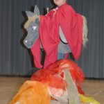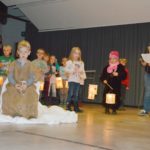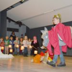 Das Rollenspiel, die Tänze und die gemeinsam gesungenen Lieder ergänzten sich zu einem schönen Martinsspiel. In den Hauptrollen spielten sehr gekonnt Marlon Ernst (St. Martin), Noah Müller (Bettler), Kim Brosemer (Bär) und Prya Schmidt (Mädchen Marina).