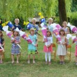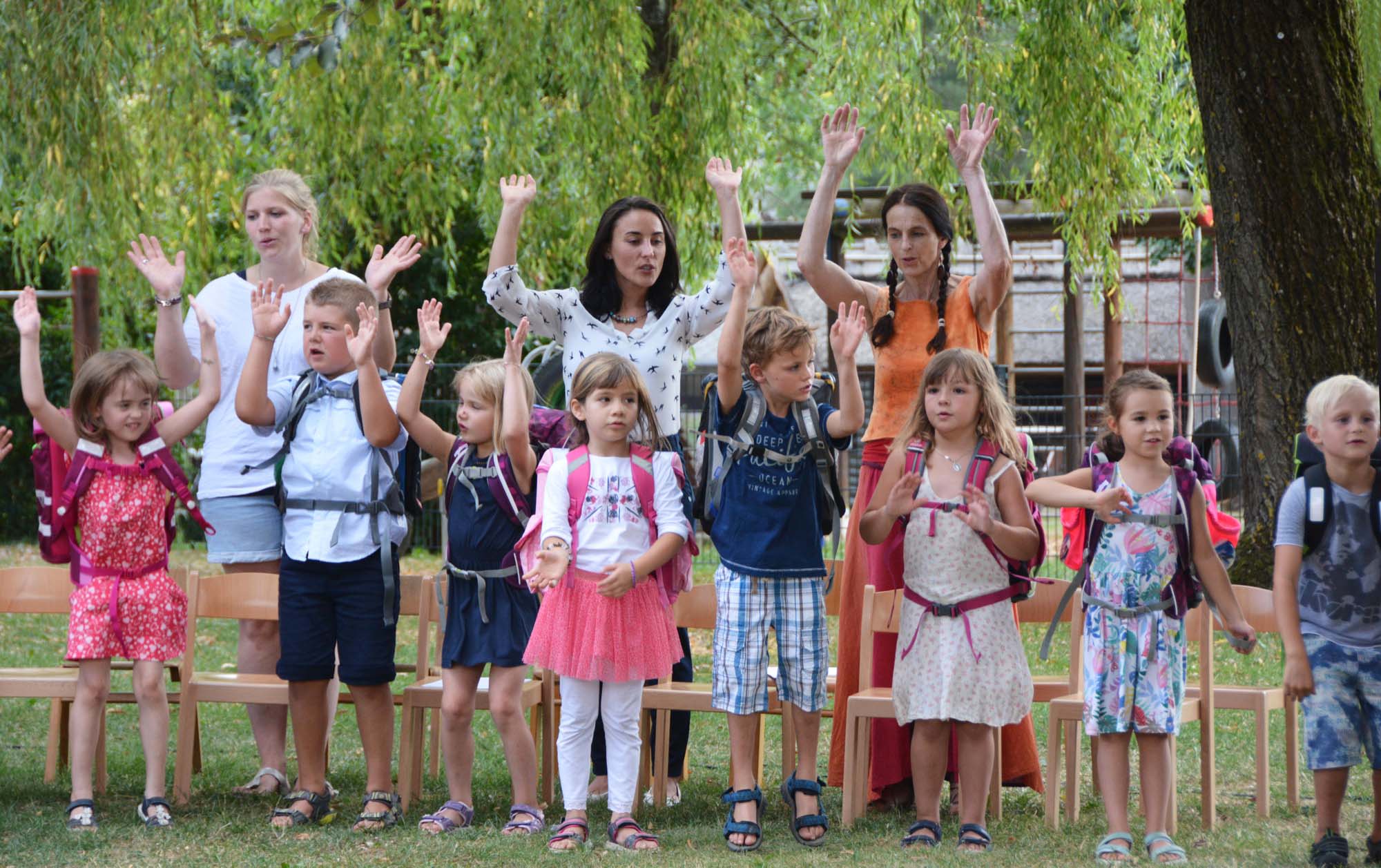 »Tschüss, goodbye, auf Wiedersehen«, sangen die Kindergartenkinder in einem ihrer Lieder und reimten in einem Gedicht: »Das Abenteuer nun beginnt, das ABC lernt jedes Kind.« Stolz nahmen sie als äußeres Zeichen dafür, dass nun ein neuer Lebensabschnitt beginnt, ihre Schultüten in Empfang und stellten sich zum gemeinsamen Gruppenbild auf. Mit dem Schulranzen auf dem Rücken waren sie bereits zuvor über die Spielwiese getanzt.