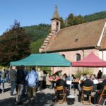 Nach dem Gottesdienst lud das Gemeindeteam die Besucher zum einem Umtrunk auf dem Vorplatz der Kapelle ein. Das Bläserensemble erfreute die Zuhörer mit heiteren und beschwingten Melodien und beflügelte die Gespräche untereinander. So feierten die Kirnbacher bei ihrer schönen Michaelskapelle wieder ein rundes Fest.