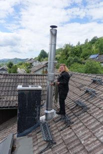 Zuhause im Lehrbetrieb ist Evelyne Pfundstein nun täglich unterwegs – in Begleitung und Aufsicht- einer der Schornsteinfeger im Betrieb. Sie fegt die Kamine nach alter Väter Sitte aus, misst und kontrolliert die Heizungs­anlagen, berät wie man den Energieverbrauch verbessern kann und hat dabei viele gute Tipps parat. Das Gehen auf den steilen Dächern beherrscht sie inzwischen auch. Lehrmeister Andreas Wurz: »Das muss man lernen, es ist lange nicht so einfach, wie es aussieht. Aber Evelyne hat das schnell kapiert, wie alles andere. Der Beruf ist ihr auf den Leib geschneidert, sie hat schon ein großes Wissen über die Zusammenhänge im Umgang mit der Energie, kennt sich aus, und ist sehr fleißig und aufmerksam. Ich würde mich freuen, wenn sie nach der Lehrzeit in unserem Betrieb weiterarbeitet.«