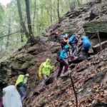 Aufgrund des Wetters wurde die Tour umgeplant. Über Neckargerach steuerte man die Margarethenschlucht an, welche eine Schlucht im Odenwälder Buntsandstein zwischen Neckargerach und Mosbach ist und auf dem Neckarsteig liegt. Der Flursbach überwindet hier 110 m auf acht Wasserfallstufen. Ein Wanderweg folgt dem Verlauf der Schlucht. Die Wandergruppe stellte sich der Herausforderung und folgte diesem Weg, was ein kleines Abenteuer war. Der Pfad ist mit Seilen und Geländern gesichert. Doch die hohen Stufen und durch den Regen aufgeweichte Pfade verlangten von der Gruppe schon einiges ab. Für alle war es ein Abenteuer und alle kamen wohlbehalten oben an. Wie für uns gemacht tauchte auch gleich eine Schutzhütte auf. Somit beschloss man, dass man eine Pause einlegt. Wer weiß, was noch kommt.