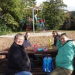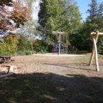 Beim neuem Buchenfeld-Spielplatz wurde an alles gedacht. Unter einer Buche und einem Ahorn ist ein schattiges Plätzchen mit Tisch und Bank hergerichtet worden für die begleitenden Erwachsenen zum Schauen und fürs Menü für die hungrigen kleinen Mäuler mit Brezel und Sprudel, je nach Wahl süß oder sauer. Schaukeln dürfen natürlich auch nicht fehlen mit Holsspänen oder Fallmatten als Untergrund.
