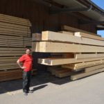 Die Dimensionen sind beeindruckend: Mächtige Weiß­tannenstämme mit bis zu 18 Metern Länge, einem Durchmesser von 1,40 Metern und bis zu sechs Tonnen Gewicht werden auf der Arbeitsfläche der Bandsäge eingespannt und dann in mehreren Arbeitsgängen mit hoher Präzision auf die gewünschten Maße gesägt.