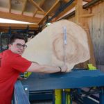 Der Blattumfang der Säge beträgt knapp neun Meter, die Schnittfuge ist nur 2,5 Millimeter dick. »Wir sind total flexibel und können die unterschiedlichsten Schnittbilder mit dieser Anlage sägen«, berichtet Kevin Burger. Während der Holzstamm fest auf der Arbeitsfläche liegt, fährt der Bediener in seiner Kabine über das Werkstück, steuert die Säge über zwei Joysticks und kontrolliert den Arbeitsprozess am Bildschirm.