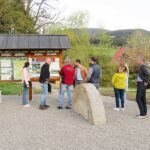 Passend dazu befindet sich eine Sitzgelegenheit, die eine Obstkiste symbolisieren soll – mit schönem Hahn und Henne Motiv auch optisch ein Hingucker. Große in den Boden eingelassene Mühlsteine weisen dem Wanderer die Laufrichtung zum Beginn des Wanderweges. »Diese Mühlsteine waren eine Idee des Betriebshofs und machen sich richtig gut«, informierte Ortsvorsteher Schütze. Ausdrücklich lobte er die Mitarbeiter des Betriebshof, die sich unter dem Leiter Matthias Fritsch mit eignen kreativen Ideen und vielen Arbeitsstunden für den Parkplatz eingesetzt haben. Die Firma Reiff hat zudem noch einen Findling auf eigene Kosten versetzt.
