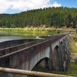 Nach der ausgiebigen Pause ging es in den Wald, an Heidelbeersträucher vorbei, bis auf 1.000 Meter über Meereshöhe. Im weiteren Verlauf ging es über Waldwege abwärts bis zum Ziel der Tour, der Linachtalsperre. An der denkmalgeschützten Staumauer angekommen bestaunten die Wanderer das beeindruckende Bauwerk. Die vor einhundert Jahren erbaute Talsperre diente bis zum Jahre 1969 zur Stromgewinnung. Seit der Sanierung im Jahr 2007 wird wieder Strom erzeugt. Bevor es über die Staumauer zur anderen Talseite ging, wurde noch einmal kurz gerastet. Dann folgte der Abstieg zur Sole der Mauer. Auch von unten betrachtet ist es ein beeindruckendes Bauwerk.