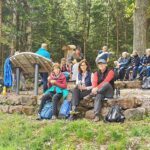 Wanderführer Klaus Pfundstein erklärte kurz den Verlauf der Wanderstrecke und den Tagesablauf, dann konnte die Wanderung starten. Ohne nennenswerte Höhenmeter verlief die Tour an den Windrädern auf der Falkenhöhe vorbei, bis man beim Reibehof auf den Lauterbacher Wandersteig stieß. Man folgte dem Wandersteig, der als Pfad abwärts zum Bremmenloch führte. Am Waldrand entlang führte die Tour mit herrlichem Ausblick auf die Bauernhöfe auf der anderen Talseite und bis zur Schwäbischen Alb zum Rastplatz der Augenblickrunde. Dort angekommen wurde eine ausgiebige Pause eingelegt. Kurz nach der Rast folgte ein längerer Anstieg, bei der die Musik vom Schellenmarkt zu hören war. Im Verlauf der Wanderung folgten zwei weitere Highlights. Als erstes der Aussichtsfelsen Hornbergblick, mit tollem Blick hinunter nach Hornberg und dann der Apfelfelsen mit Aussicht ins Reichenbachtal und bis zum Landwassereck. Entlang an storrigen, alten Bäumen führte ein schmaler Pfad zurück zur eigentlichen Wanderstrecke und schließlich zum Startpunkt.