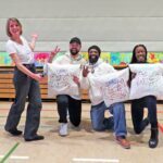 Schulleiterin Katrin Bolten berichtete von einer tollen Tanz woche und machte den Tanzcoaches ein Kompliment: Allen hat es viel Spaß gemacht und das Projekt war ein großer Erfolg. Dies bestätigten auch die Kinder, die sie spontan dazu befragte. Als Dank überreichte sie den Tanzcoaches jedem ein Kissen mit den Motiven des Künstlers Keith Harding, die zappelnden Männchen – das Markenzeichen des Künstlers – waren auch auf die T-Shirts der Tanzkinder gedruckt.