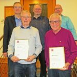 Für 40 Jahre aktive Mitgliedschaft im Männerchor wurden Albert Gutmann und Walter Boger geehrt. Beide erhielten lobende Worte, Urkunden und Anstecknadeln. Gutmann hatte als Sängersprecher besondere Verantwortung übernommen und war stellvertretender Schriftführer im Verwaltungsrat. Walter Bogner hatte sich zeitweise um die Pressearbeit gekümmert. Beide erhielten lobende Worte des Verbandspräsidenten Thomas Schenk, Urkunde und Anstecknadel sowie den Applaus der Versammlung. Für 25 Jahre aktive Mitgliedschaft wurden Manfred Klein (Tenor) und Jürgen Weng ausgezeichnet. Wenig ist seit 2013 im Vorstand und engagiert sich seit 20 Jahren für die EDV und Datenpflege des Vereins. Auch sie erhielten Worte der Anerkennung, Präsente und den Beifall der Versammlung. Am Ende der Versammlung gab Jürgen Wenig die besten Probenbesucher bekannt, die mit einem Präsent belohnt wurden.