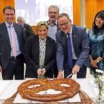 Stärken konnten sich die Gäste danach an der Neujahrsbrezel, die Obermeister Heinrich Schulz von der Bäckerinnung Ortenau traditionell überreichte und von Landrat Scherer gemeinsam mit seiner Ehefrau Dr. Evgeniya Scherer und Kultusministerin Eisenmann angeschnitten und verteilt wurde. Genussvolle Wissens-Bissen und Bildungs-Happen servierte abschließend Martin Foshag mit seiner Heimat-Küchencrew aus dem Malerhaus Achern.